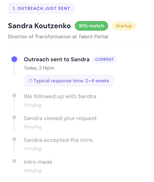 The timeline appears on your dashboard below the context card for each intro request. It updates automatically as the introduction progresses.