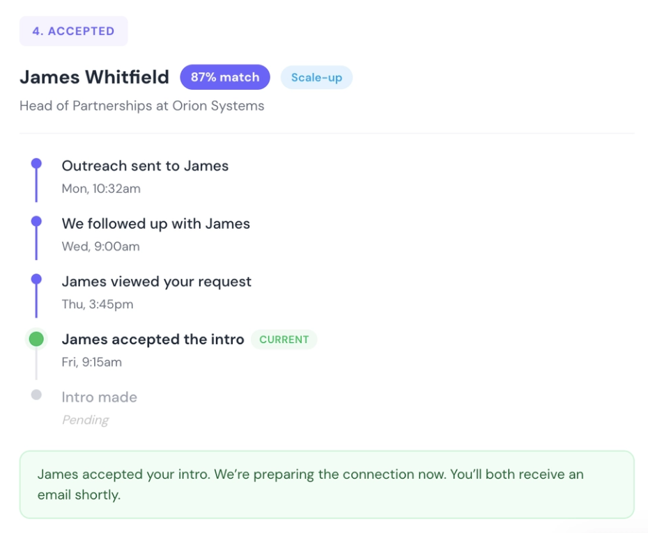 Statuses only move forward. The typical positive path is: Outreach Sent, Reminder Sent, Viewed, Accepted, Intro Made. If the decision-maker declines or does not respond, the timeline reflects that clearly.