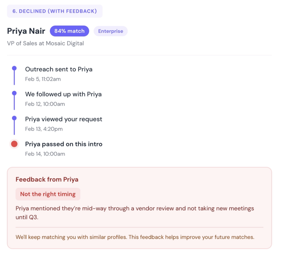 Declined — The decision-maker passed on this intro. You will see a short reason tag and, where available, a feedback note explaining why. This helps you refine your targeting for future matches.